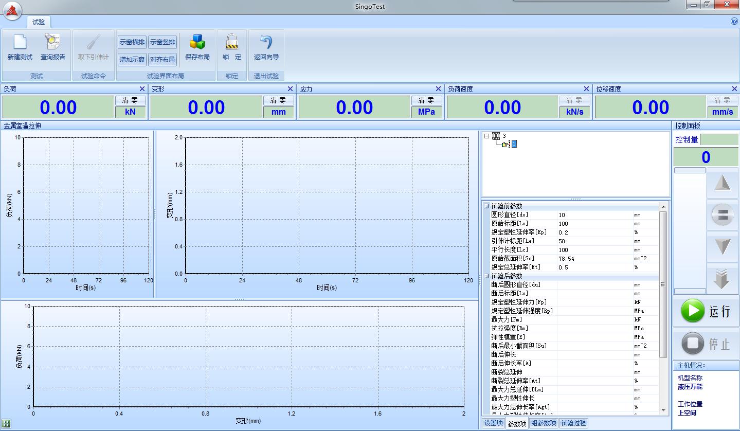 主機為兩立柱、兩絲杠、油缸下置式,拉伸空間位于主機的上方,壓縮、彎曲試驗空間位于主機下橫梁和工作臺之間。測控系統(tǒng)采用全數(shù)字多通道閉環(huán)測控系統(tǒng),具有三閉環(huán)功能,即可以進行應力、應變、位移閉環(huán)等控制方式,并可以進行無沖擊切換,其應力速度和應變速率完全符合國標GB/T228.1-2010等其它金屬拉伸試驗標準要求。