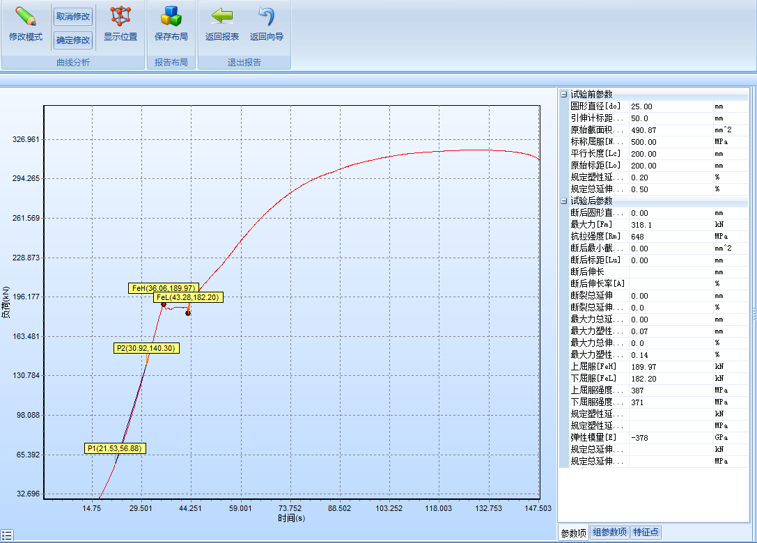 (5)數(shù)據(jù)處理分析界面:可根據(jù)用戶要求自動求取,ReH 、ReL、Fm、Rp0.2、Rt0.5、Rm、E等