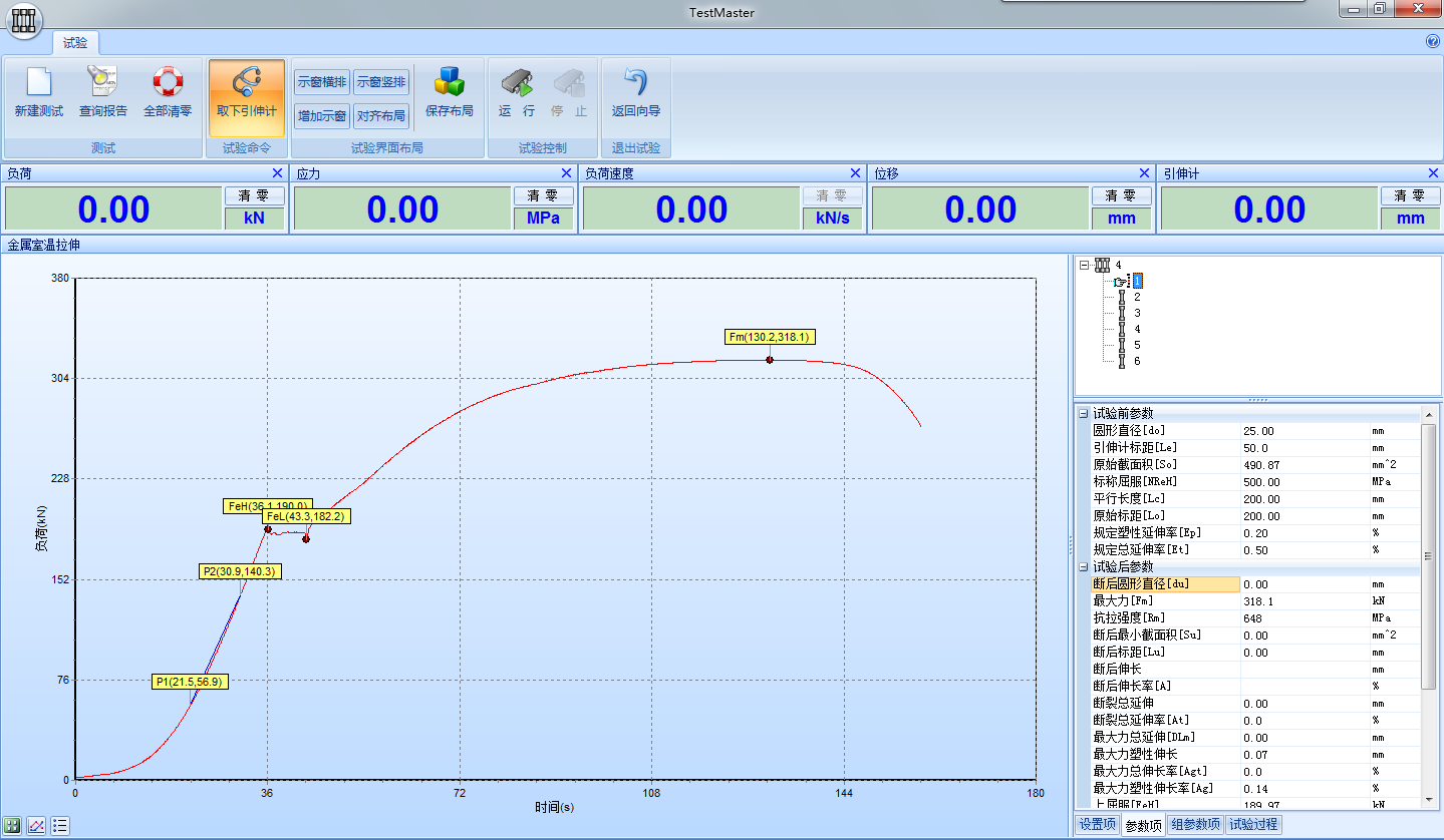 (4)數(shù)據(jù)處理分析界面:可根據(jù)用戶要求自動求取,ReH 、ReL、Fm、Rp0.2、Rt0.5、Rm、E等